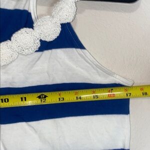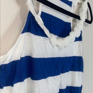 Blue and white striped tank top with lace crochet like patterned straps!