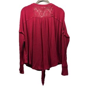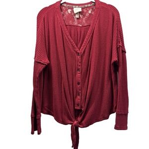 Knox Rose Women's Waffle Knit Top Sz L Red Waist Tie Button Up Long Sleeve Lace
