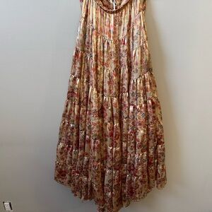Absolutely gorgeous Free People Something Magical Maxi length bronze metallic shiny floral printed dress, tiered skirt design with a tie top design , can be tied in the front or back. Over the shoulders or as a tube style top. So many different ways to wear and style this dress! Definitely a show stopping piece! Photos do not do this dress justice!