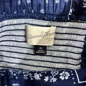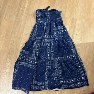 Blue paisley type print universal threads bandeau smocked strapless dress. Size XS. Has grips to help dress stay up. True to size.