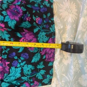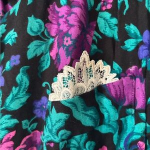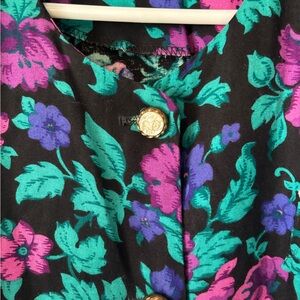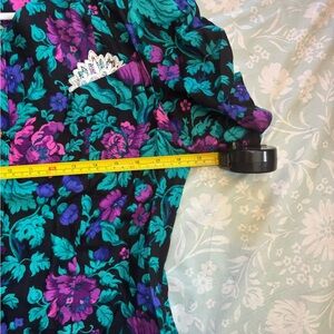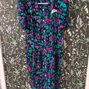 Gorgeously vibrant vintage Ultra Dress midi dress with a bold all-over floral print in black, magenta, purple, and teal. This classic 80s/90s piece features a full button-down front, short puff sleeves, and a flattering fit, perfect for a cottagecore, grunge, or retro look. The lightweight fabric is likely a cotton or rayon blend, ideal for spring and summer. Features a cute little decorative detail near the neckline.Note on Sizing: Vintage clothing often runs smaller than modern sizing, so please refer to measurements for the best fit.