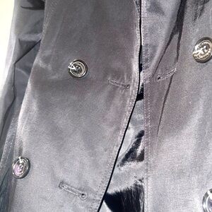 Sleek black trench coat by Tommy Hilfiger. Double-breasted design. Ideal for stylish layering. Only wear is shown in picture with the buckles on sleeves.