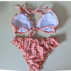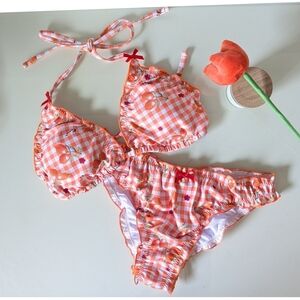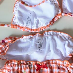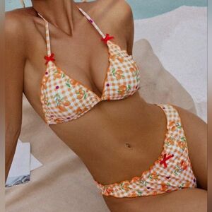 Shein 2Pcs Set Lemon Orange Plaid Bikini With Red Bows.