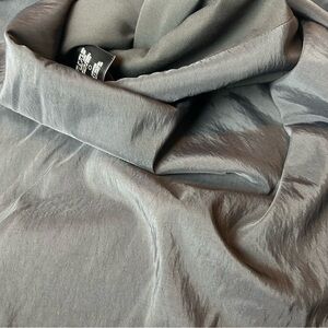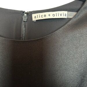 Alice + Olivia black satin look sleeveless scoop neck drop waist front pleat mini skater dress has a two tone satin look that makes for the perfect little black dress for an evening out, holidays, events, party, or office party with a tweed blazer over top! It has a 3/4” long back zipper with a hook and eye closures the neck. It is slightly longer in the back to make it a high/low skirt portion. Polyester blend.Classic with a twist. It has a few stress lines that are barely noticeable. I didn’t see them until I had the photography lights on it to take photos. The last couple photos show them. As you will see they are not noticeable but I do want to disclose them. Size 10 measurements are PTP 17 1/2” waist 15 1/2” length front 30 1/2” length back 34” back zipper 22” long(ND)