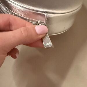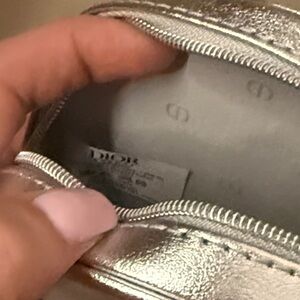 Chic Dior round case in a shimmering silver finish. Ideal for small essentials.