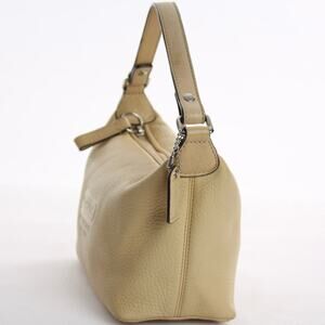 Coach pochette bag crafted in grained pebbled leather with single handle and embossed logo detailing.