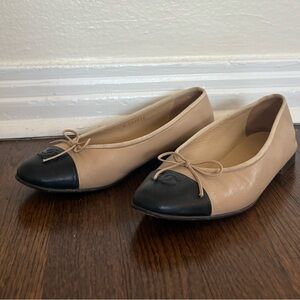 Classic CHANEL ballet flats, in cream and black goatskin leather with tiny heel.