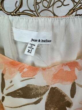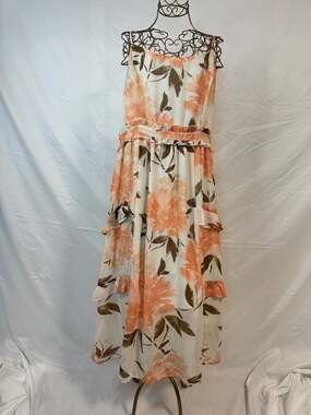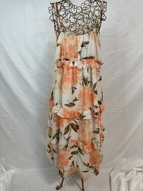 June & Hudson Floral Ruffle Tiered Chiffon Maxi Dress in Peach/Cream, Size XL. This beautiful, flowy maxi dress features a romantic peach and cream floral print with contrast olive green leaves. It is designed with delicate spaghetti straps, a ruffled waistline, and a tiered skirt for added movement. The lightweight chiffon material makes it perfect for summer weddings, beach vacations, or garden parties. Excellent pre-owned condition with no visible signs of wear.