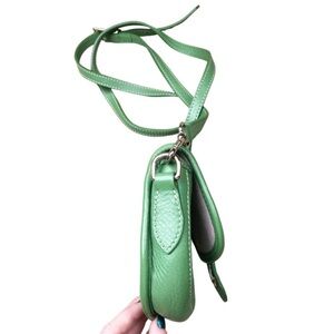 Keywords: green bag, leather crossbody, small purse, saddle bag, flap bag, snap closure, adjustable strap, pebbled leather, minimalist, classic, everyday bag, compact purse, shoulder bag