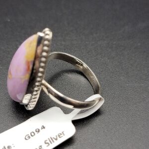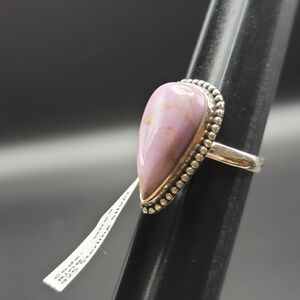 Beautiful genuine phosphosiderite ring in a flattering pear/teardrop shape set in solid sterling silver (stamped 925). Soft lavender‑purple stone with natural golden veining and a detailed beaded border gives it a unique boho, Southwestern feel. Ring size is 6.5 and stone face measures approximately 11.8mm x 19.2mm (please see photos and measure your finger to ensure best fit). Brand new/never worn. Perfect as a statement ring, gift for a crystal lover, or add a pop of color to your everyday jewelry collection.