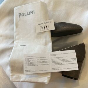 POLLINI PEWTER LEATHER BLOCK HEEL PUMPS. NEW. SILVER PIPING AROUND THE SHOE FOR A BEAUTIFUL SOPHISTICATED LOOK. TRUE TO SIZE. REGULAR PRICE $300