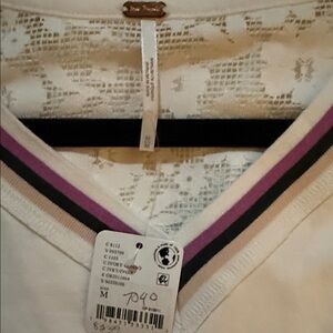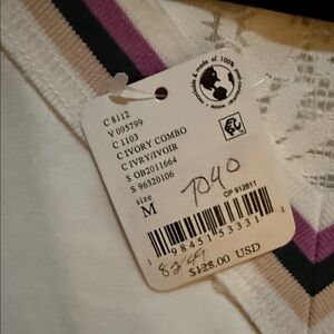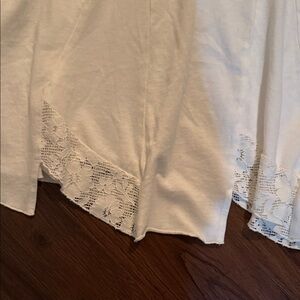 Features: Cotton jersey fabrication, V-neckline, striped trim, drop-shoulder short sleeves, godet inserts, raw hem, lace panels