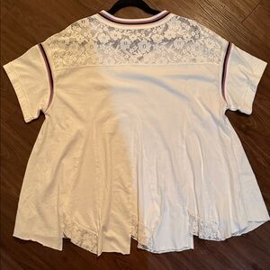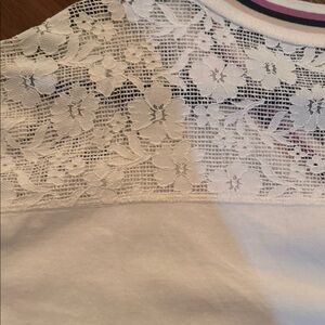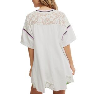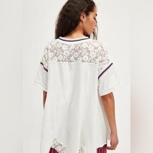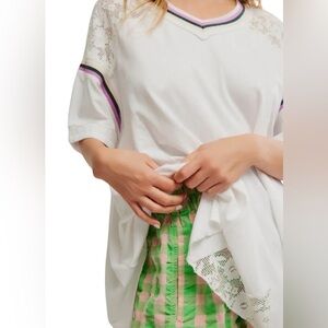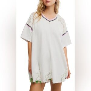 Effortlessly combining two contrasting vibes, this oversized tee features sporty striped trim and femme lace panels for a unique twist. Pair with anything from baggy jeans to a silky slip skirt.