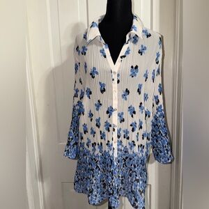 Colorful paisley sleeveless top with a flowing design. Features shades of blue, red, and white. Brand: storelines. Women's size large.