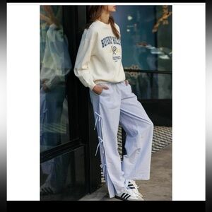 Fashion Design: STRIPED SIDE TIE PULL-ON COTTON PANTS. The premium lightweight quality oxford cotton fabric feels comfortable on the skin. These pull on pants features classic striped pattern, side-tie detailing, a waistband, and an ultra-slouchy relaxed leg so you can move around in total comfort.