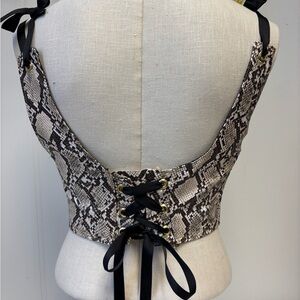 Stylish snakeskin print bustier top with black strap accents. Made from a faux leather exterior and polyester lining. Equipped with boning and Adjustable tie up ribbon straps.
