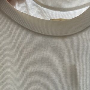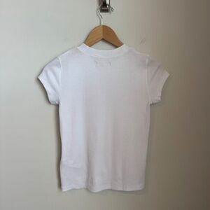 New with tags, Madewell eyelet tee in size XXS. White Supima rib knit. There is a very faint makeup mark from try-on; I will pre-spot before washing. Fitted style, designed to hit between the belly button and high hip. Shrunken fit looks great with baggy jeans.