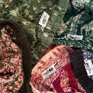 5 boho baggy elephant pants, great to wear with a crop top. One is from Etsy and doesn’t have a tag. The rest were from The Elephant Pants, which no longer exists. Great deal, as these were $30 each and you’re getting five of them. These are USED and may show signs of wear. The one from Etsy has a bit of dye run in the waistband (shown in photos) but it honestly looks intentional