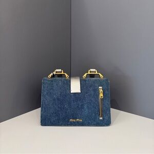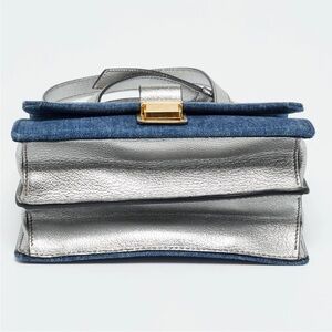Elevate your look with this stunning and versatile Miu Miu bag. This piece perfectly blends casual dark blue denim with luxurious metallic silver Madras goatskin leather for a chic, contemporary aesthetic.