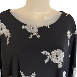 Chic black tunic with white floral design. Flowy and stylish.