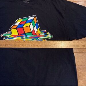 Black tee shirt with front graphic of a melting Rubik’s Cube. In excellent pre owned condition. Size XL.