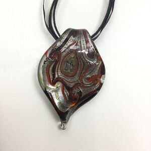 Orange, Gray & black pulled glass handmade necklace. Necklace is about 10-11 inches long. Pulled glass design has silver, gold, black & metallic gold colors in it. The back of the glass piece is black. Strap is made from string and ribbon. Attached clasp is silver. This necklace is simply beautiful! Carefully packaged, quick shipping, 900+ items sold!
