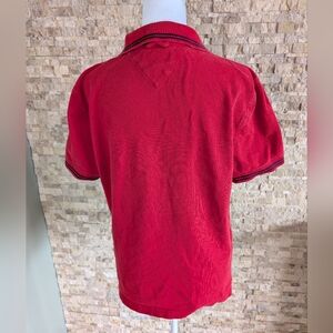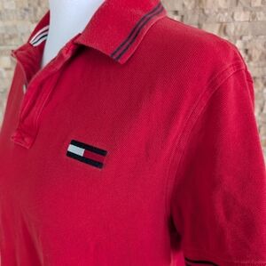 90s style Tommy Hilfiger Denim Polo with Embroidered Logo Red 90s Fashion in men's Size small. Manufactured in 2018 but worn 100% cotton (see photos for details) and giving vintage retro vibes. Custom fit collection short sleeve polo.