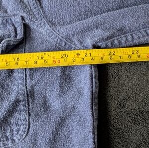 Vintage Field & Stream Blue Chamois Fabric Flannel Button Up Work Utility Shirt, no size tag but measures at about a mens Medium. Rugged granola outdoor hiking aesthetic, heritage brand Field & Stream. Heavy weight chamois flannel fabric.