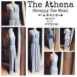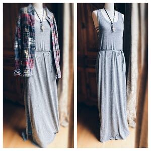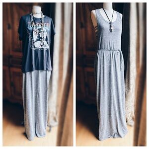 Grey strappy maxi tee with belted tie . straps on the sides of underarm and back.vented openings on both sides of the dress. Wear alone in warmer weather and layer in cooler weather like shown in the photos. Dress Only this listing. Plaid button down is coming soon , cross necklace and buffalo tee are listed and Blondie coming soon . Colorful beaded necklace not for sale. Msrp78.00 Size S : pit to pit 17” / 62” L NWT
