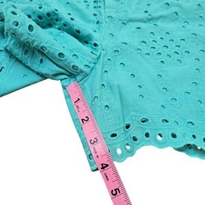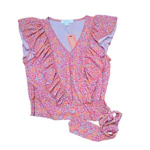 Charming two-piece set featuring a vibrant floral top and eyelet shorts. The top showcases a lively floral pattern with ruffled detailing and a tie-waist for a flattering silhouette. Complementing the top are a pair of eyelet shorts in a solid color, adding a touch of elegance and breathability to the ensemble. This set offers a coordinated look that's both stylish and comfortable. TOP IS LARGE & BOTTOMS SZ 10