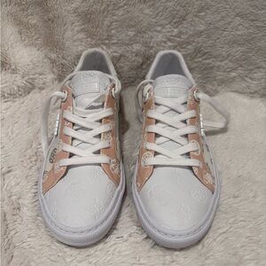 Step into effortless baddie energy with these GUESS white and peach sneakers. Clean white meets soft peach accents with signature GUESS logo detailing for that polished streetwear vibe. These sneakers are the perfect mix of cute, confident, and casually luxe. Never worn