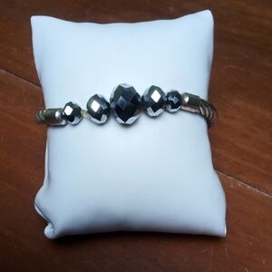 The bracelet is stretchy with silver colored beads, silver colored rope on the sides, and two silver colored spacers with clear stones.