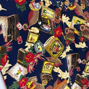 Vibrant shirt with a mix of graphic prints. Features a lively design on a dark background.