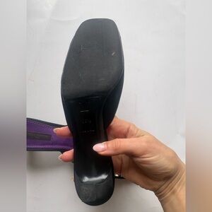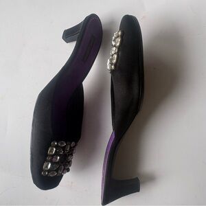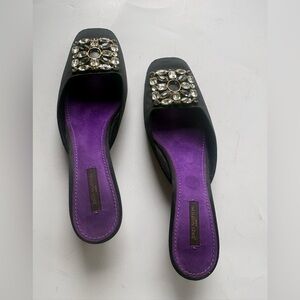 Chic black mules with a striking purple insole. Adorned with crystal embellishments for a touch of glamour.