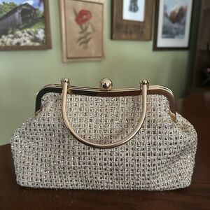 Glittered, woven texture with gold accents. Great for weddings or special events. Crossbody chain is detachable. Used once.
