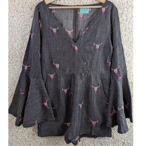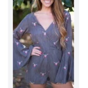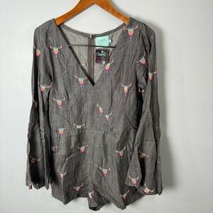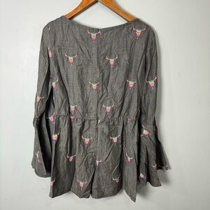 Western Grey chambray romper with colorful cow head embroidered detail! Perfect for the coastal cowgirl western trend, a country concert outfit, or a unique summer night out!