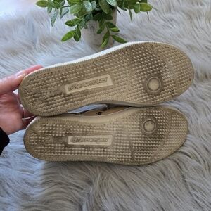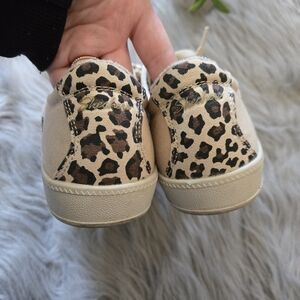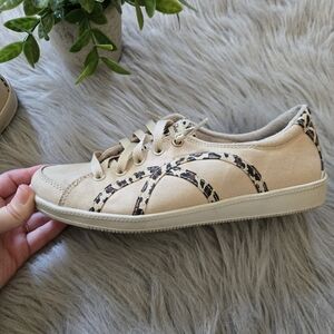 Step out in style with these chic cream sneakers featuring a trendy leopard print design. Perfect for casual outings, these shoes offer both comfort and flair. skechers foam insole. size 7. very good condition.