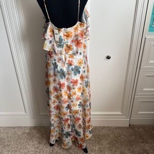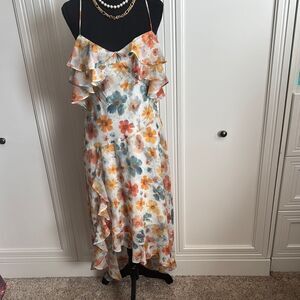This stunning dress features a flowing tiered silhouette in vibrant orange and cream hues. The sleeveless design is adorned with ruffled details that add a romantic touch, making it perfect for a wedding guest or cocktail occasion.