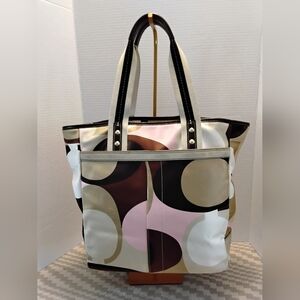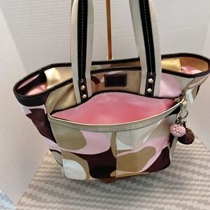 Vintage Coach Hampton Scarf Print Tote wth vibrant multicolors of pink, white, beige, tan and brown. Bag features a blend of fabric and leather with suede and matching umbrella made in the mid 2000's. Exterior has silky satin-like material