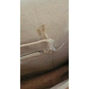 Some discoloration inside front zipper pocket, and seam is loose on smaller inside zipper pocket as shown in last photos.