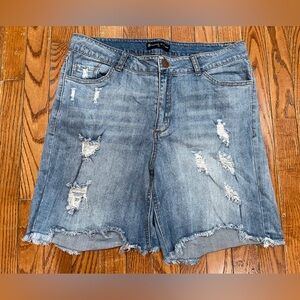 Trendy jean shorts with distressed details. Frayed hem adds style. Perfect for casual wear.