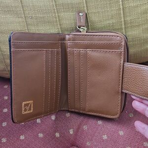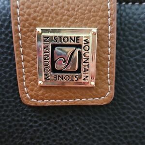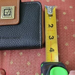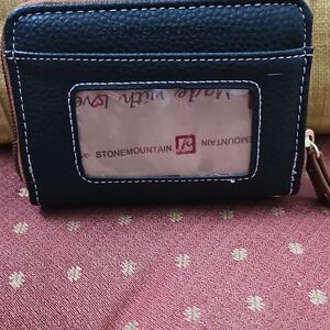 Stone Mountain's stylish black and brown wallet has a snap closure, seven spots for credit cards ,space for bills, place for coins and within that another zippered closure and the bigger one has a zippered closure, clear spot on the back for a license,and ring for keys.