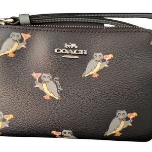 Stylish Coach wristlet featuring a charming owl print. Perfect for carrying essentials.