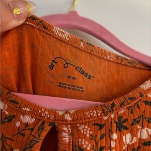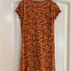 Vibrant orange dress with floral design. This is a girls size medium keyhole tshirt dress. Worn 2-3 times and has been put away since spring 2025 and now my daughter has outgrown it.