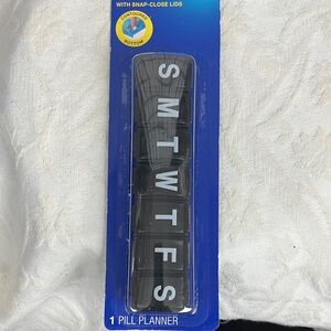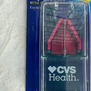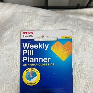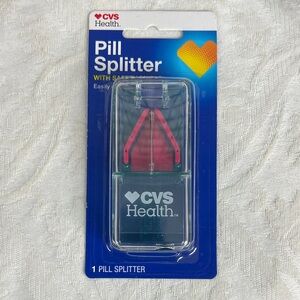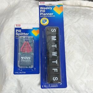 CVS Health set includes a pill splitter and a weekly pill planner. The pill splitter is clear with pink accents. The weekly planner is black with white lettering. 7 days.