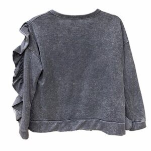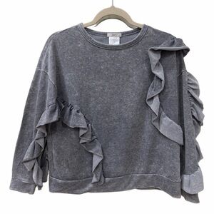 Soft, cozy fabric with a relaxed fit and ribbed hem/cuffs. The washed charcoal gray color makes it easy to style while the layered ruffles add that trendy, boutique vibe.
