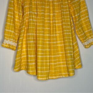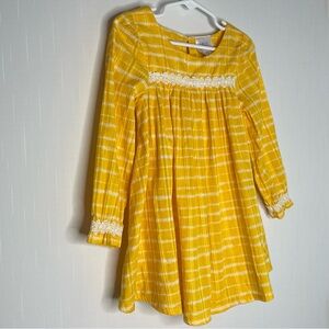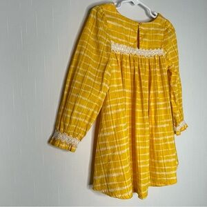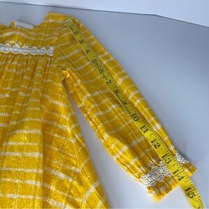 Very good preowned condition. Falls Creek girl's long sleeve yellow and white plaid dress. A vibrant yellow and white plaid pattern. Beautiful white lace trim across the chest and matching lace at the sleeve cuffs, back button and loop. 100% cotton, lightweight. It has a relaxed, smock-like fit, often categorized as a "peasant style". No stains or holes, measurements in pictures size 3T