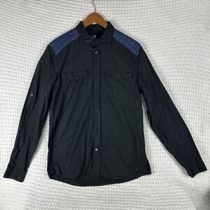 H&M Men Black Long Shirt Blue Quilted Shoulder Patches Two Chest Pockets Size M