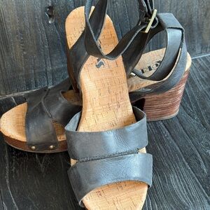 Korks Black Leather Strappy Cork Block Heel Comfort Sandals Size 9.5M