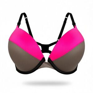 Victoria's Secret bra 32DDD, Very Sexy push up, VS push-up bra, colorblock bra, hot pink bra, gray pink bra, padded bra, underwire push-up, sexy lingerie, supportive push-up, everyday bra, deep plunge push up, VSX style, women's 32DDD bra, VS 32DDD